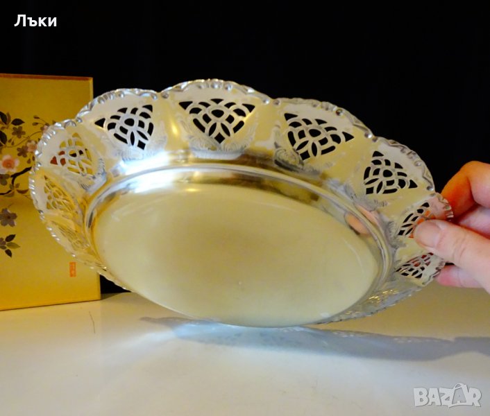 Немско плато,фруктиера,съд за сервиране,изработено от як бронз,посребрено с висока проба сребро.По края декорирано с релефни барокови орнаменти и ажур.Височина 3 см.,диаметър 26 см.,тегло 270 гр.
