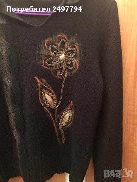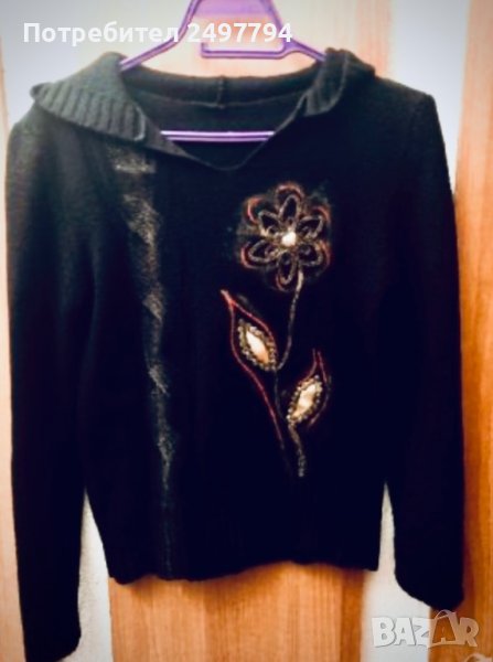 Много елегантен бутиков пуловер, с красив орнамент отпред и качулка