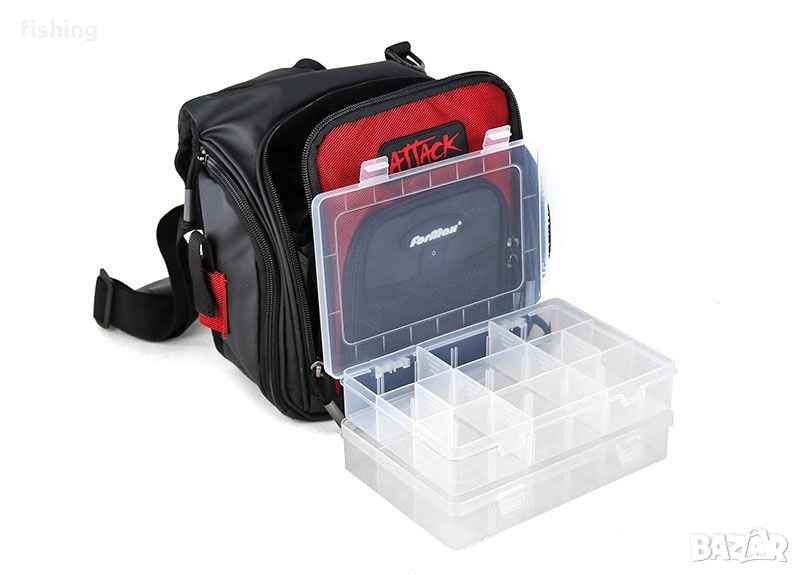 В големия джоб на чантата са разположени две кутии с размери: 20х13х4см, както и EVA пяна за закачане на блесни, мухи и други изкуствени примамки.
