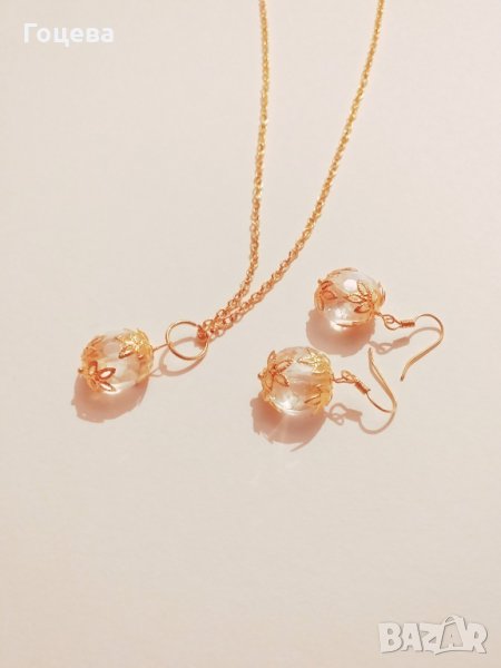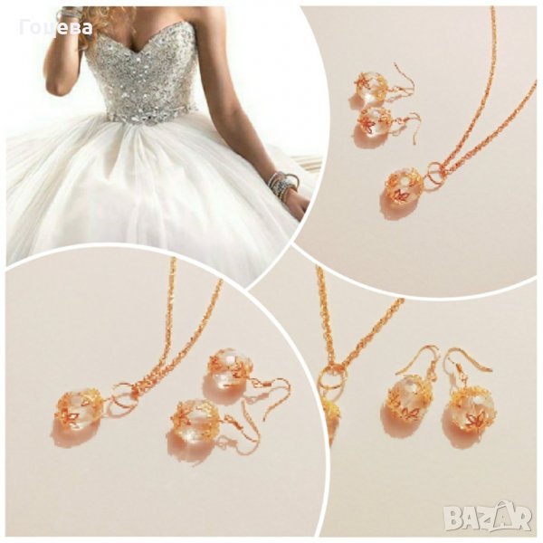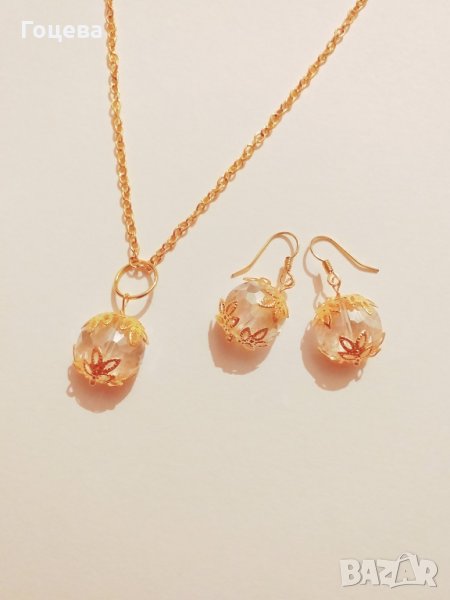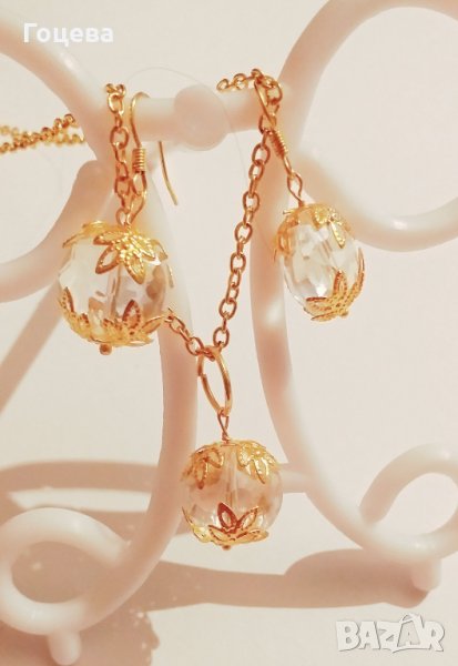 Изящен сет с фини кристали и филигрирани орнаменти в цвят Злато . Женствен и много нежен комплект. Ръчна изработка . За принцеса . Дължина на верижката - 45 см. Размер на кристала - 1.5 см. Дължина на обеците с кукичките - 3.2 см. Цена на комплекта - 25 лв.