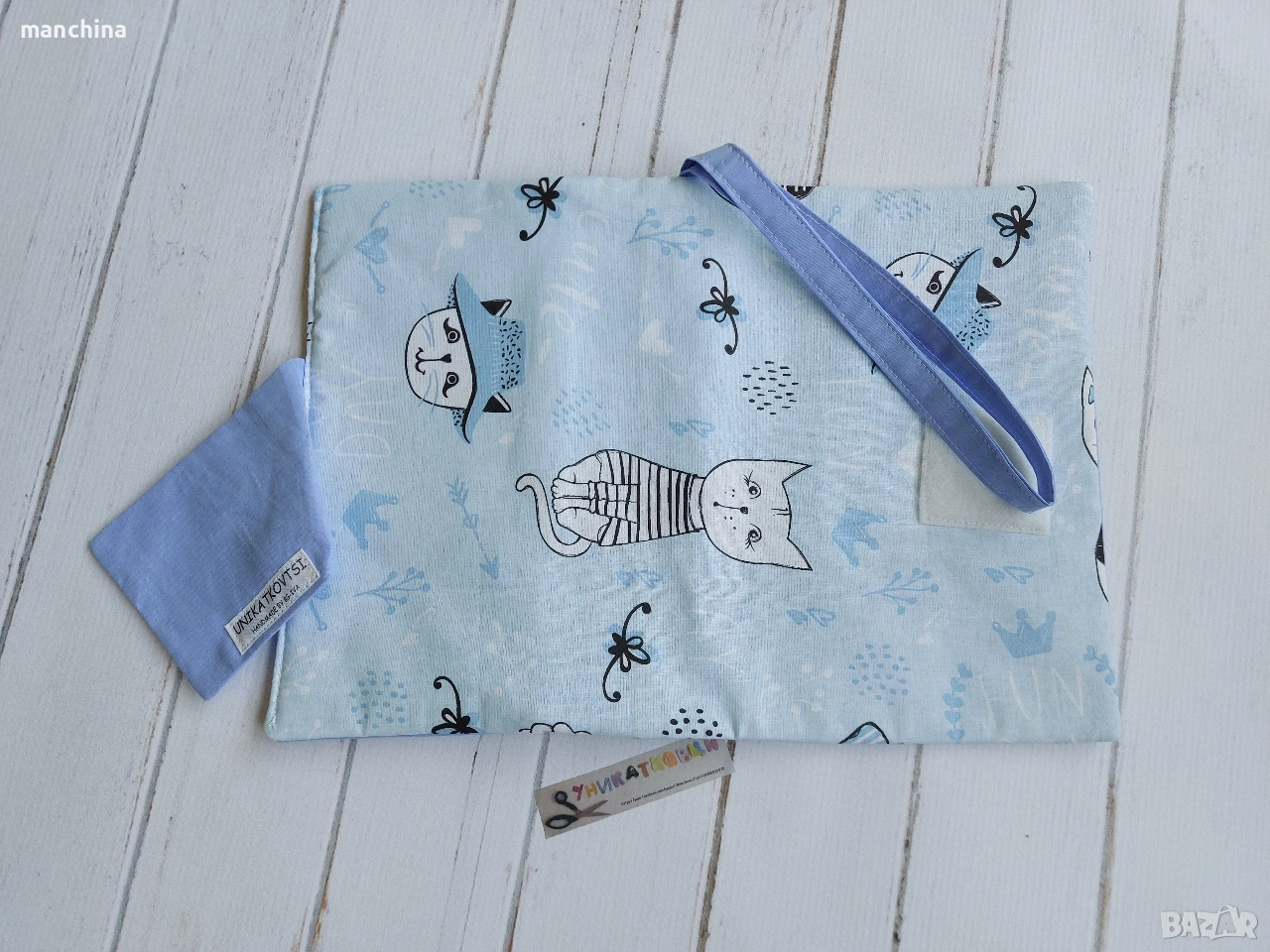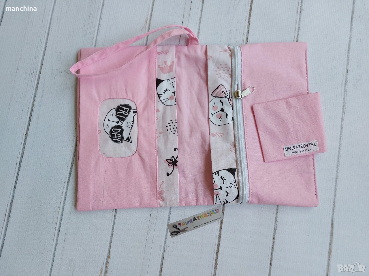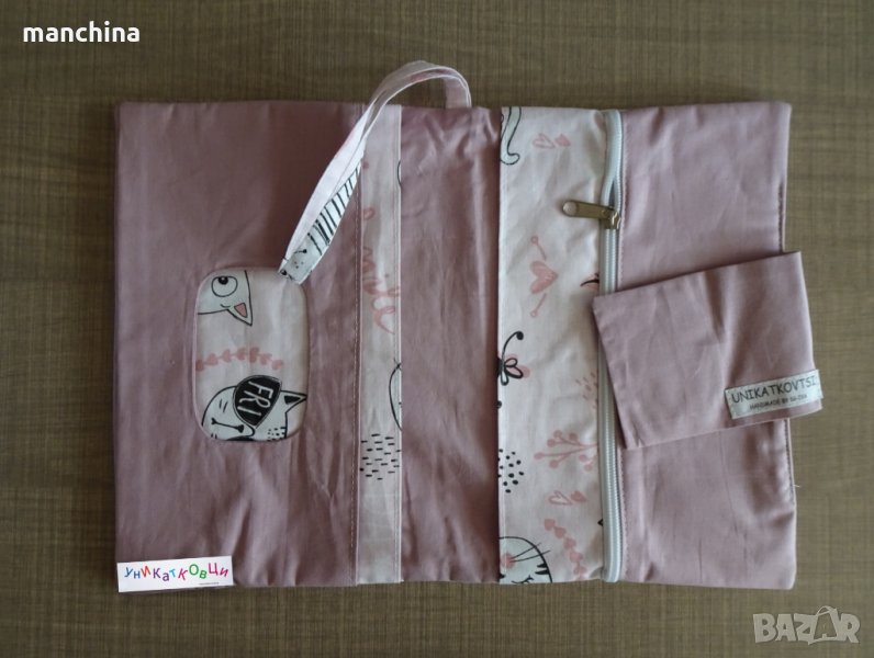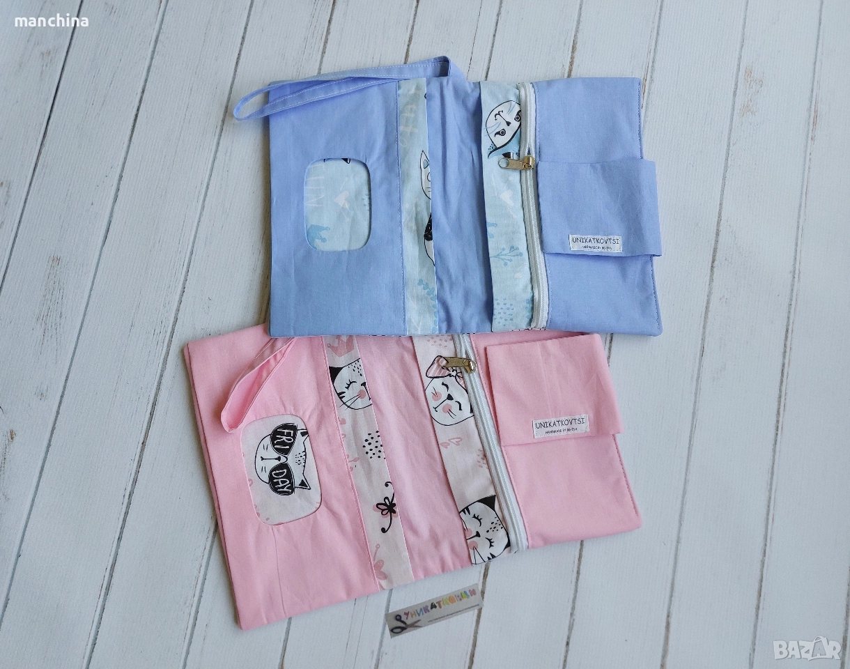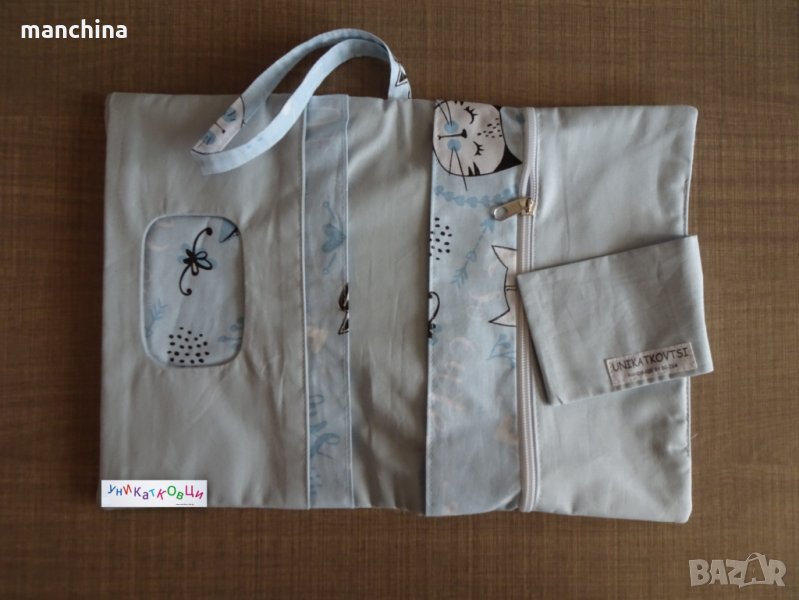 Органайзер с 4 отделения- 1 за мокри кърпи, 2 за пелени/памперси и 1 с цип за по-дребни необходимости по време на разходка. Има удобна дръжка за носене. Изработен от памучни платове, подплатен с вата.