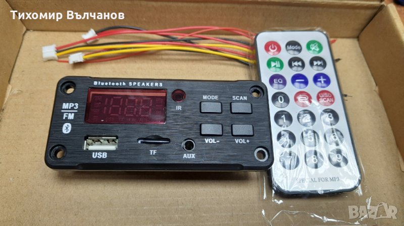 MP3 модул за вграждане.Поддържа Bluethoot,micro SD card,USB, FM radio,AUX вход.WMA,WAV,FLAC,APEЗахранващо напрежение 8- 12 волта/1A .Дистанционно управление и кабели в комплекта.Възможност за монтиране в автомобил, окачени тавани за узвоучаване на помещения, в домашни аудио системи и други. Размери 41/91mm дълбочина-само 15mm. Дистанционното няма батерия.Ако искате да добавя такава се заплаща +1 лв. за батерия.