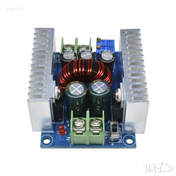 При широк диапазон на входното напрежение от 6 V до 40 V, преобразувателят може точно да контролира изходното напрежение и ток. Ефективността може да достигне 96%, измерена при 20А, преобразуване на 24 V в 12 V. Той е проектиран с двойна MOS тръба с висок ток 75 V / 80A. На входа и изхода се използва високочестотен електролитен кондензатор с ниско съпротивление, ниска пулсация, стабилен изход. Окабеляването е удобно с тези големи 30A токови винтови клеми. Понижаващият модул има 2 радиатора, при нужда могат да бъдат увеличени. Когато има голяма разлика между входното и изходното напрежение, моля, намалете мощността и тока.