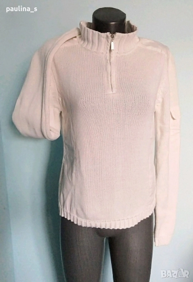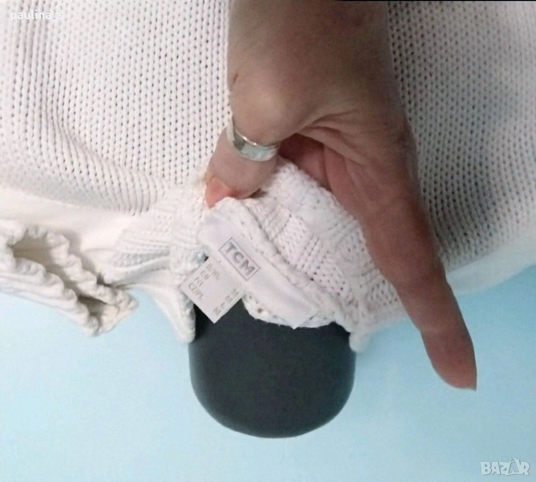 2️⃣ Винтидж! M / 2XL - "TCM". Цената е крайна, без пазарлъци 29,99лв / 15 евро. Бял брандов пуловер тип суичър с висока яка, декорации от платки в страни, джоб на ръкава и висока поло яка с цип. Моделът е прав, но платките дават вталяване при обличане, ръкавите се носят подгънати. Материята е 100 % органичен памук, хипоалергична и плътна, плетката дава възможност да се носи от няколко размера и скъсява ръкавите.