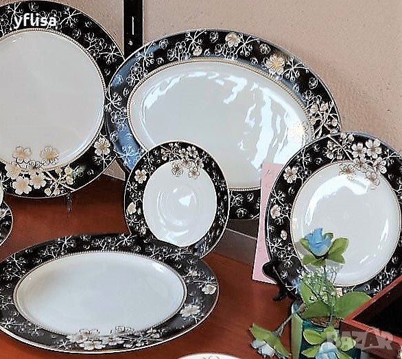 Луксозен комплект за хранене - 20 части от висококачествен костен порцелан "YoLiSa" с черен декор, който контрастира с белотата на порцелана и ръчно рисувани, дискретни златни цветя, които му придават изтънченост и свежест.