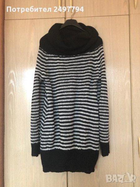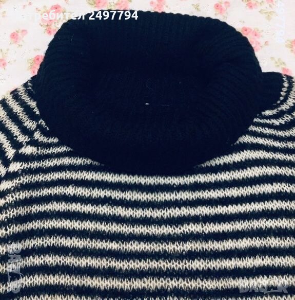 Страхотен пуловер Mango, на черни и бели райета, пада свободно, подходящ за зимните дни, с шал яка, може да се използва и като туника, без забележки.