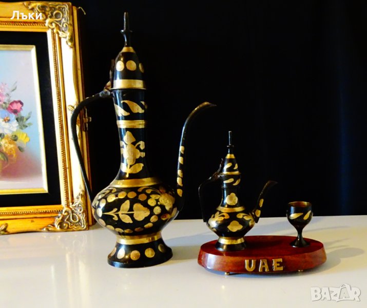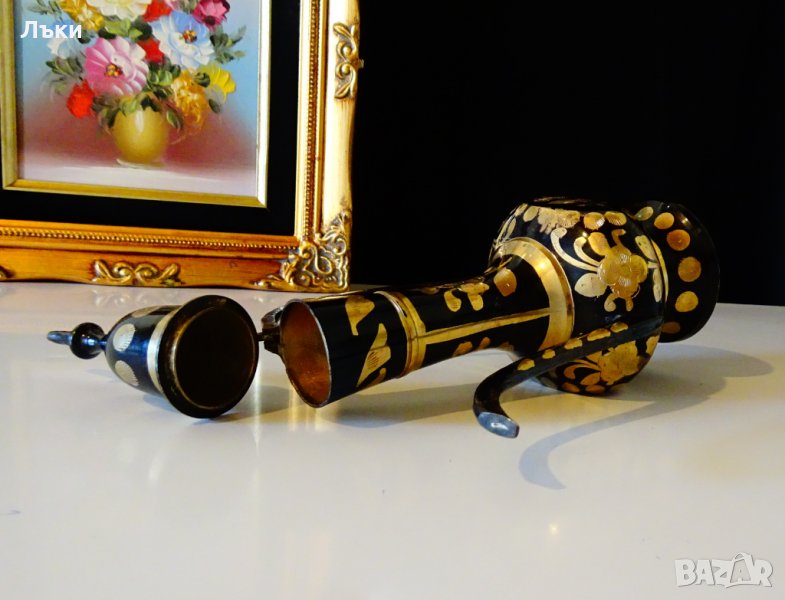Индия.Ръчно декорирана с релефно гравирани флорални мотиви и позлата.Височина 25 см.,дължина 16 см.,диаметър 10 см.Тегло 350 гр.