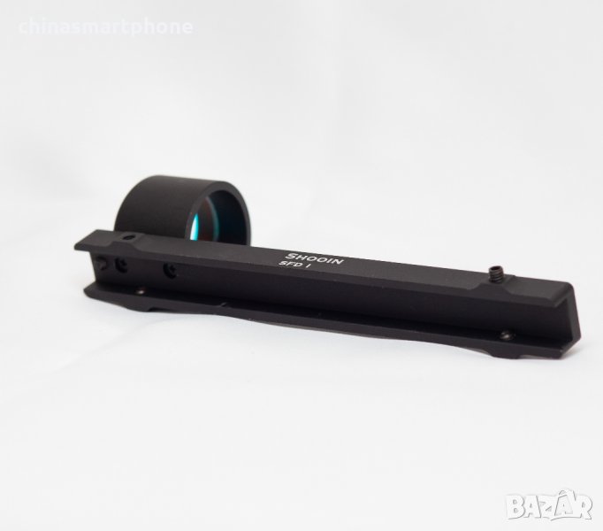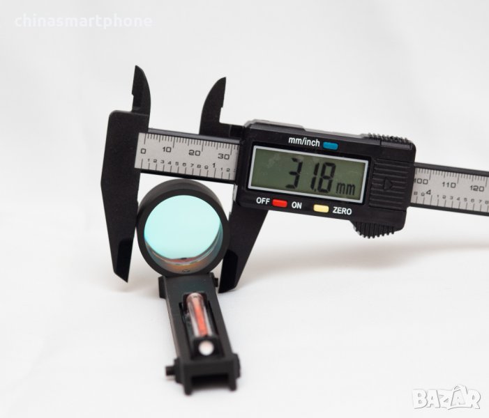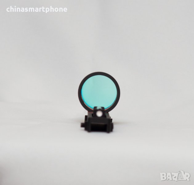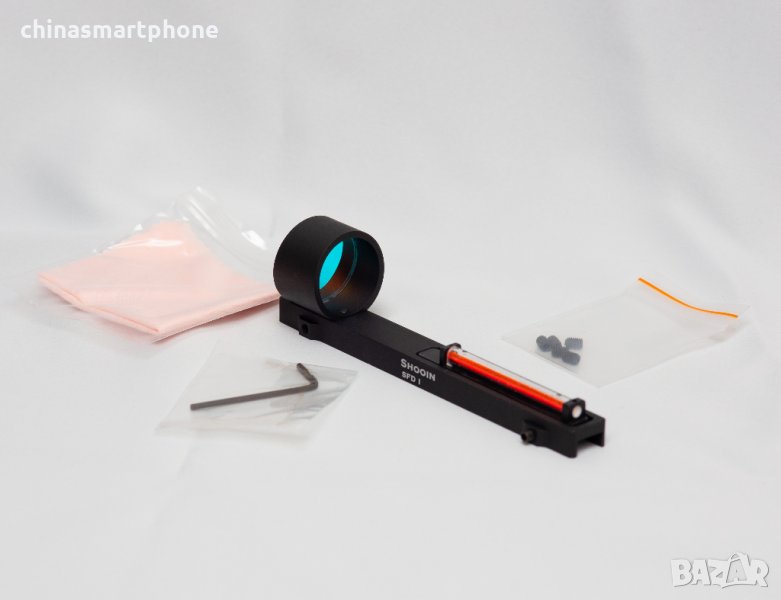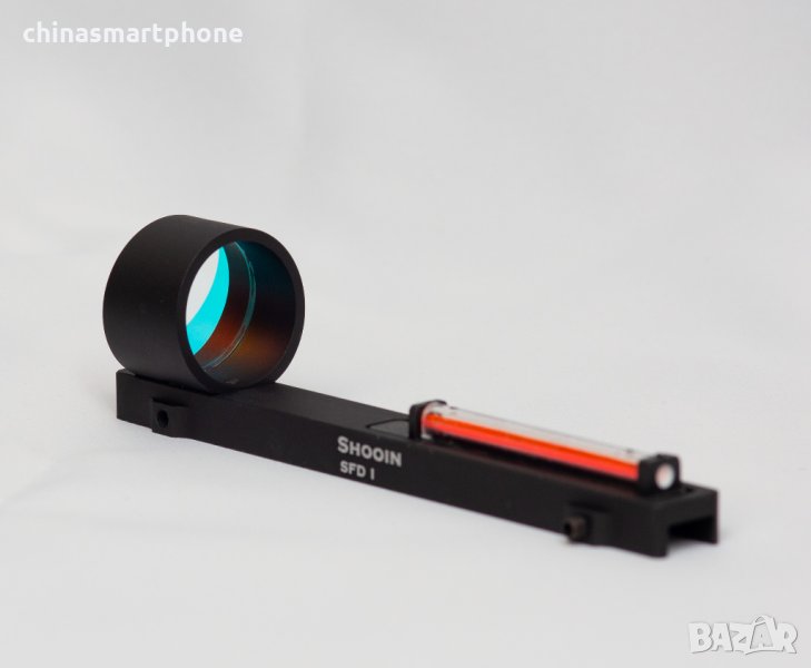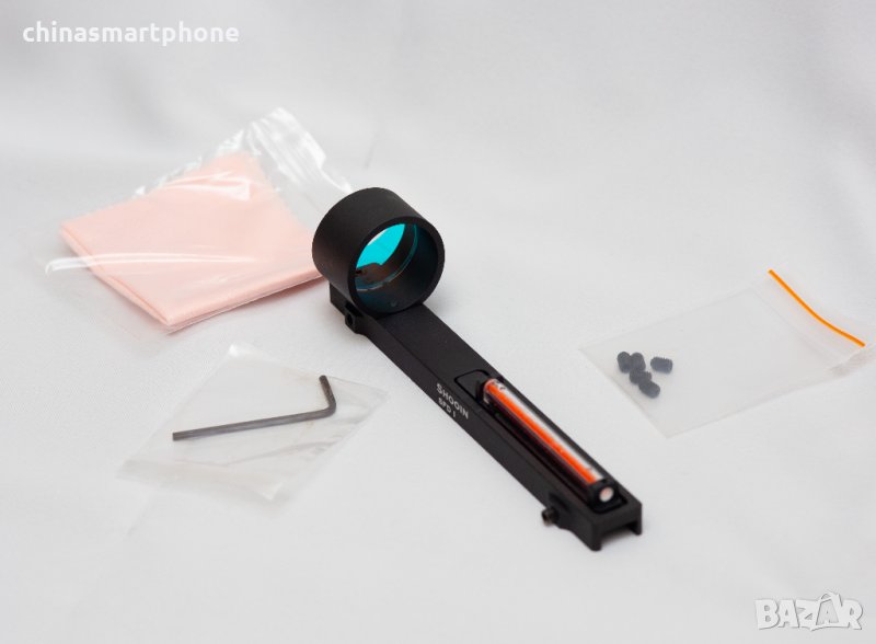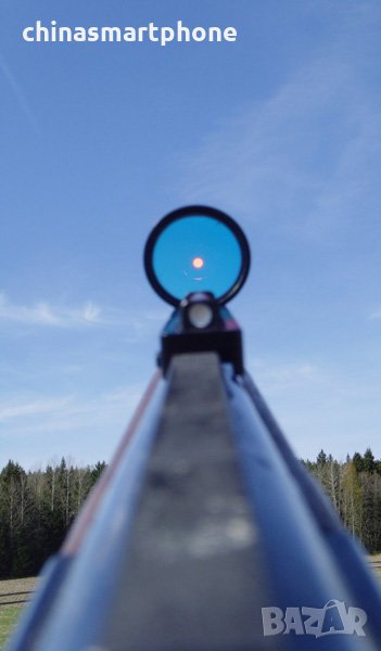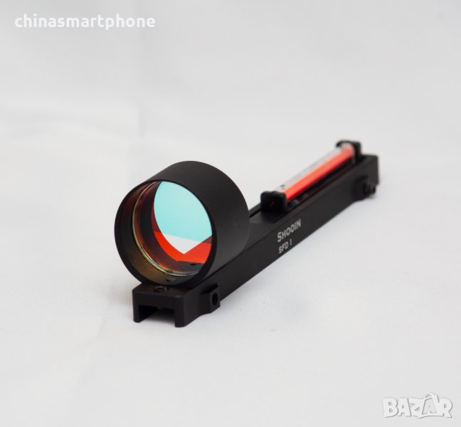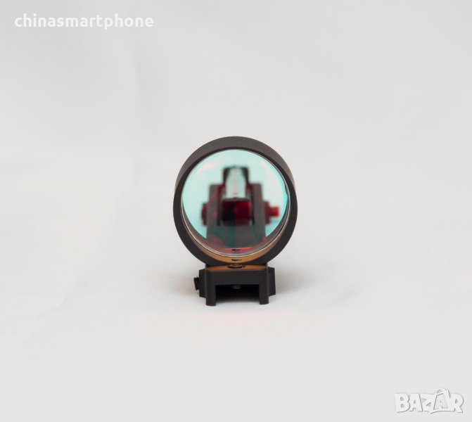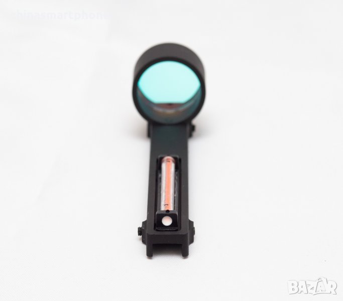 оръжие. Подходящ за невентилирана мерна линия /плътна/. Монтажът е доста лесен. Скалата е с червена точка в средата. Няма батерия и не се нуждае от монтаж или база на гладкоцевно оръжие. Поставената червена тръбичка поема светлината и я излъчва като точка на стъклото. Монтира се към мерната планка със скрепителни винтове като от тях се и регулира, включени в комплекта.