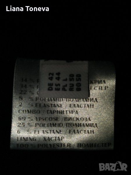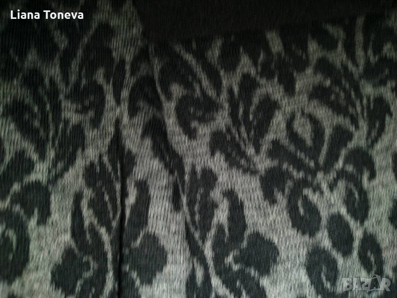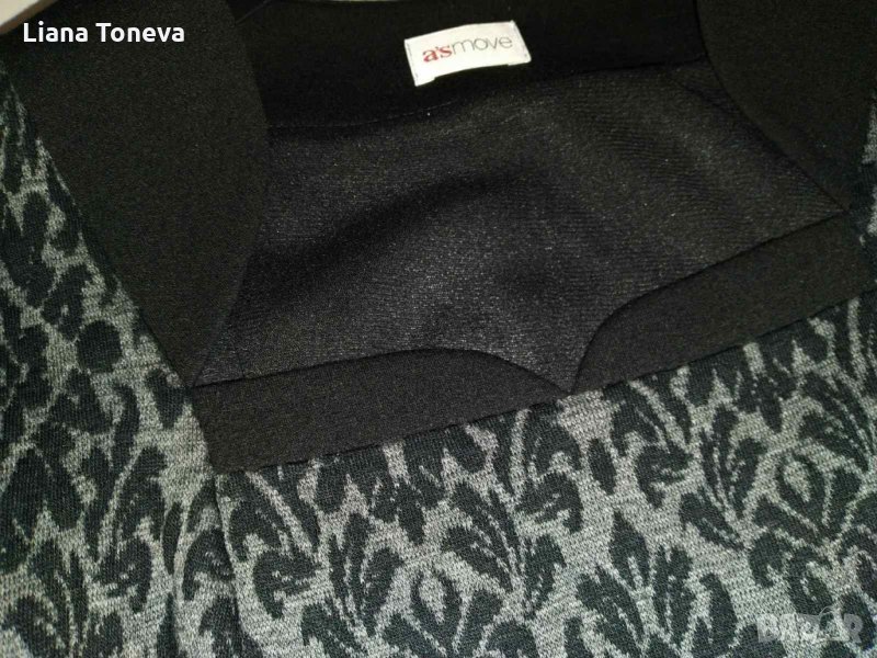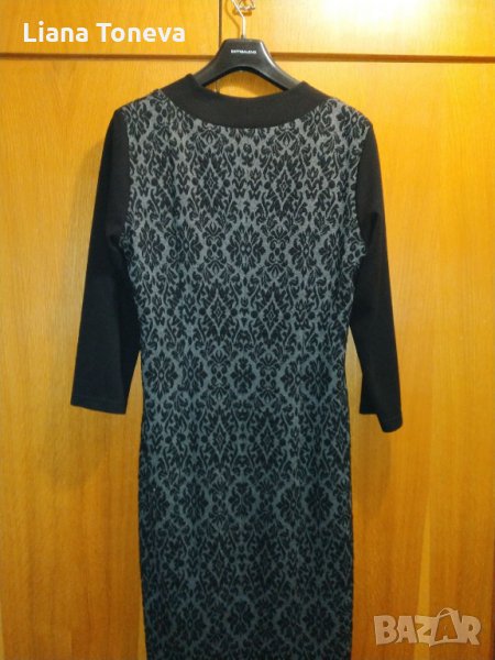 Дамска елегантна рокля на "Аристон" от трикотажен плат в черно и сиво,с подплата,вискоза и еластан,дължина от врат до подгьв -108см,грьдна обиколка- 94см,талия-87-88см,ханш-102см,дьлжина от подмишницата до подгьва-86см,номер-50.