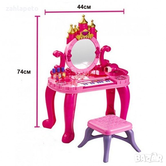 Тази детска тоалетка с пиано на батерии и столче ще стане една от любимите детски играчки на вашата малка принцеса. Комплектът съдържа масичка за гримиране, пиано, столче, безопасно детско огледало, сешоар и аксесоари. Пианото разполага с 13 клавиша и работи с 2 бр АА батерии (не са включени). Пианото работа в два режима, които се превключват от най-левия клавиш. В първият режим детето свири само, натискайки клавишите, при втория режим при натискането на клавишите се възпроизвеждат различни вградени мелодии. Тази детска играчка разполага и със сешоар, работещ с 1 бр АА батерия ( не е включена ), който имитира истински такъв. Височината на детската тоалетка със столче е 74 см, широчината е 44 см.