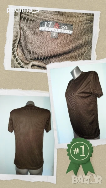 2️⃣. Колаж / Мъжка маркова спортна блуза "17 & со". Цената е крайна 34,99лв / 17,3 евро. Цветът е тъмно кафяв, материята е рипсена ликра, еластична и покрива няколко размера. СНИМКИ НА ДАМСКИ МАНЕКЕН. Една бройка, без дефекти, като нова.