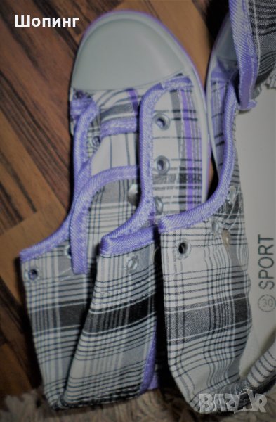 Нови детски обувки №30. Леки, от плат каре - лилаво (на снимките изглежда синьо) със сребристи нишки. С връзки и закопчаване тик-так, може езикът да се вдига. Стелка 19 см.