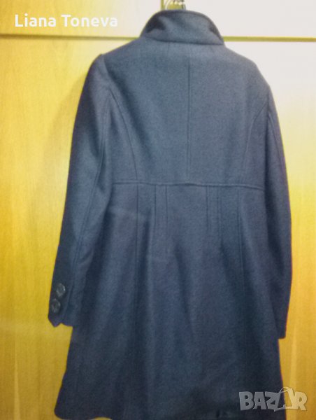 Тъмносиньо вълнено палто,дължина 96см,талия-90-91см,ханш-112см,от рамо до рамо-44см.Цветьт е наситен към мастилен,не може да се види на снимките.