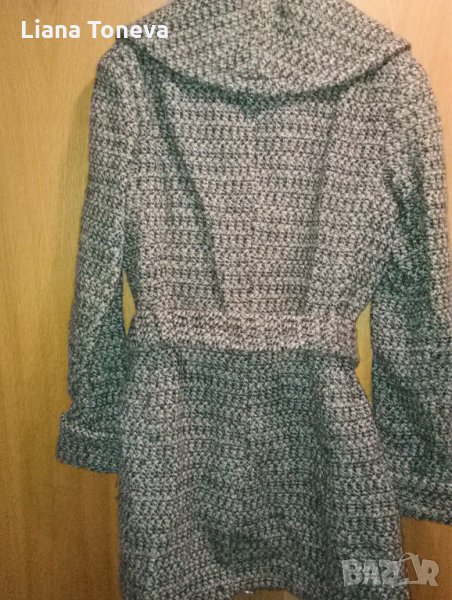 Вълнено ,елегантно палто в черно,сиво и сребьрна нишка,с колан,подплата,тип"прегърни ме",дължина рамо-подгъв-80см,ханш-98см,от рамо до рамо-44см.