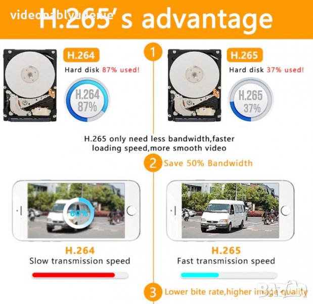 Идеалният алгоритъм на компресията е подобрен H.265+ основен профил с усъвършенствана техника за филтриране пространство-време намалява видео потока най-малко с 50%.