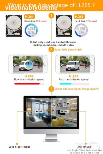 - Разликите при компресия H.265 е че прави до 40% по малки записи в сравнение с H.264 с по-малък битрейт, което е в плюс ако интернет връзката е по-бавна, при това без да се разваля качеството на картина, дори нещо повече – контраста и цветовете са със една идея по-добри.