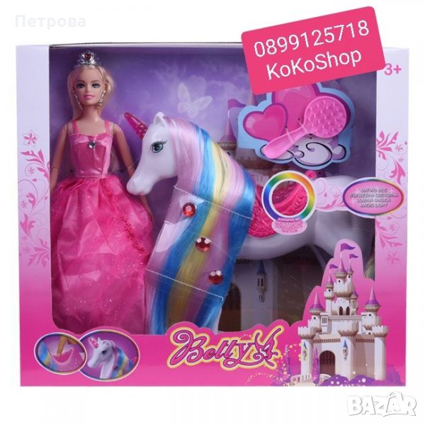 Куклата е с дълга руса коса,с корона на главата и е облечена с прелестна розова рокля. Еднорогът е с красива цветна грива,а седлото му свети. В комплекта е включена и четка за коса.