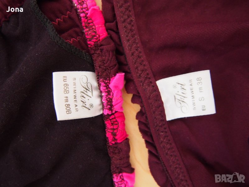 Бански от две части на българската марка флирт. Зармерите по етикет са" горнище 65Б, долнище С, но според мен е ХС.