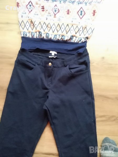 Дамски тъмносин клинпанталон, еластичен, фирма Майорал, размер 18. Бяла блузка на Юнона, размер С и шарена блузка с еластан, универсален размер