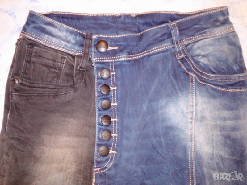 Интересни много еластични дънки екстравагантен и елегантен модел–комбинация от син и сив крачол.