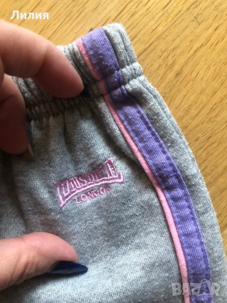 Горнище с качулка и два кенгуро-джоба в много ярко розаво със сиво, долнище във сиво с лилави кантове, с ластици на крачолите.