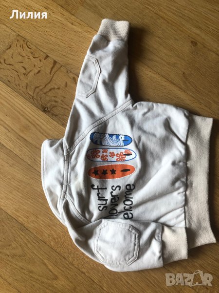 9) Суетшърт, с много щампи на гърди и на гърба, цвят бледо бежаво.