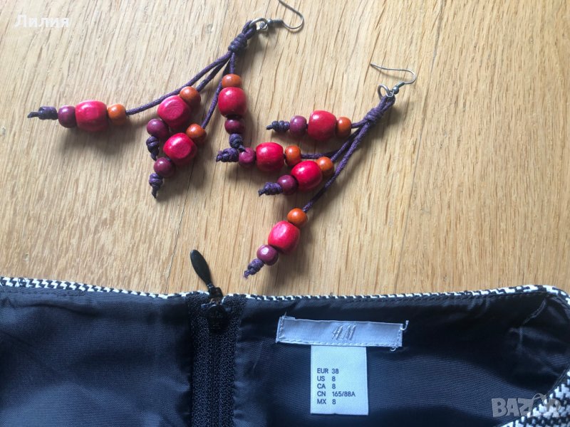 Към роклята с колана предлагам обеци, слагани 1-2 пъти. Изработени са от цветен лилав шнур с дървени мъниста.