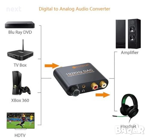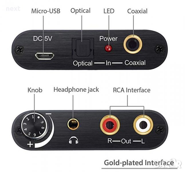 + Преобразува оптичен (Toslink) или коаксиален (Coaxial) цифрови аудио сигнали в аналогов RCA (чинч) L / R и се свързва с външно устройство, като например усилвател чрез 3,5 мм кабел за слушалки.