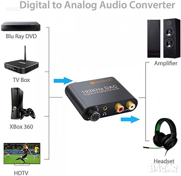 + Лесно инсталиране и работа, перфектно работа с всеки източник на възпроизвеждане с оптичен (TOSLINK) или коаксиален цифров аудио изход, като цифрови и HD телевизори, сателитни приемници, CD / DVD / Blu-Ray плейъри и игрови конзоли.