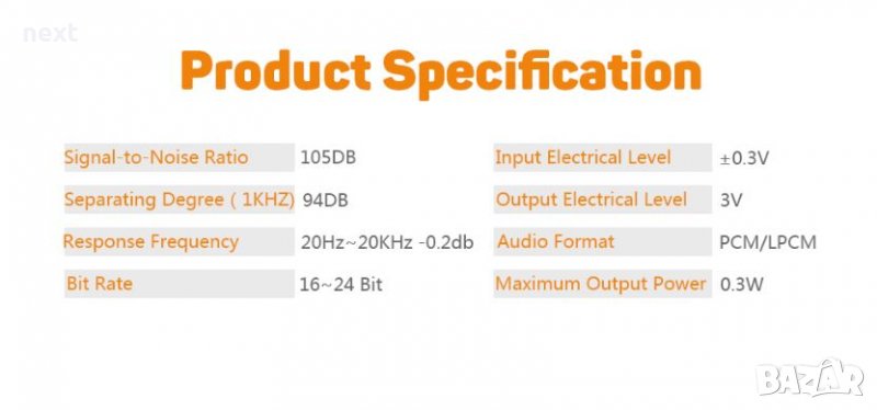 + Поддържа честота 192KHz, 96KHz, 48KHz, 44.1KHz, 32KHz и 24-битов S / PDIF входящ поток на левия и десния канал.