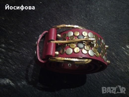 Ефектен колан от червена еко кожа с множество метални капси. Нормални следи от употреба, видни от последната снимка.