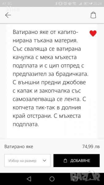 Страхотен зимен модел. Много е топло и плътно. Лек, прав, свободен модел. Не е носено интензивно, обличано е броени пъти и остана излишно! Поръчано от сайта на редовна цена от 74.90 лв. * * * Мерките са- ширина ок. 50 см. Дължина от рамо 77 см. Ръкав от рамо ок. 62 см. Ширина от рамо рамо ок. 40 см.
