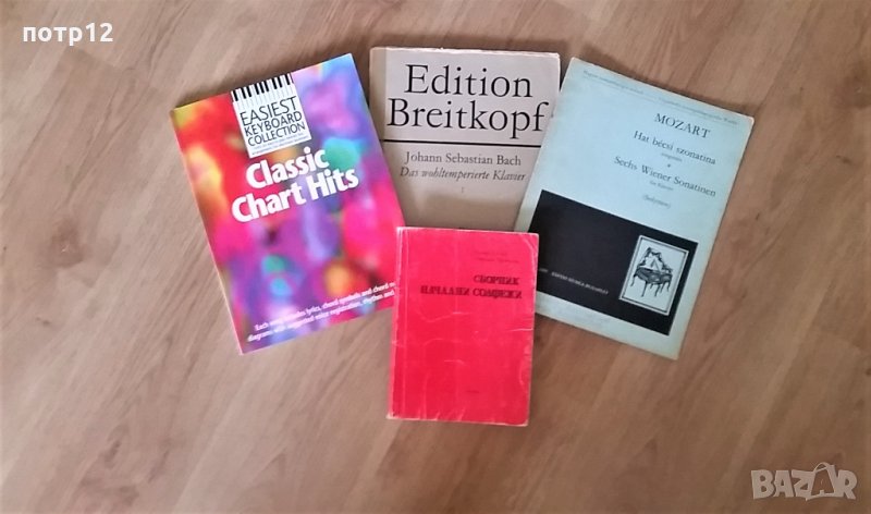 Ноти, сборници с музикални произведения, школи за пиано, акордеон и китара. Оригинални издания на "Peters", "Kenneth Baker", HANON, Бах, български и др. Музикални школи с пиеси и етюди. Класика, хитове, джаз, поп, евъргрийни, рок, шлагери: