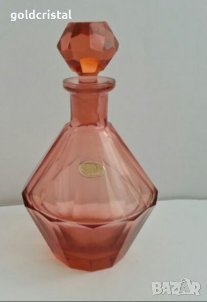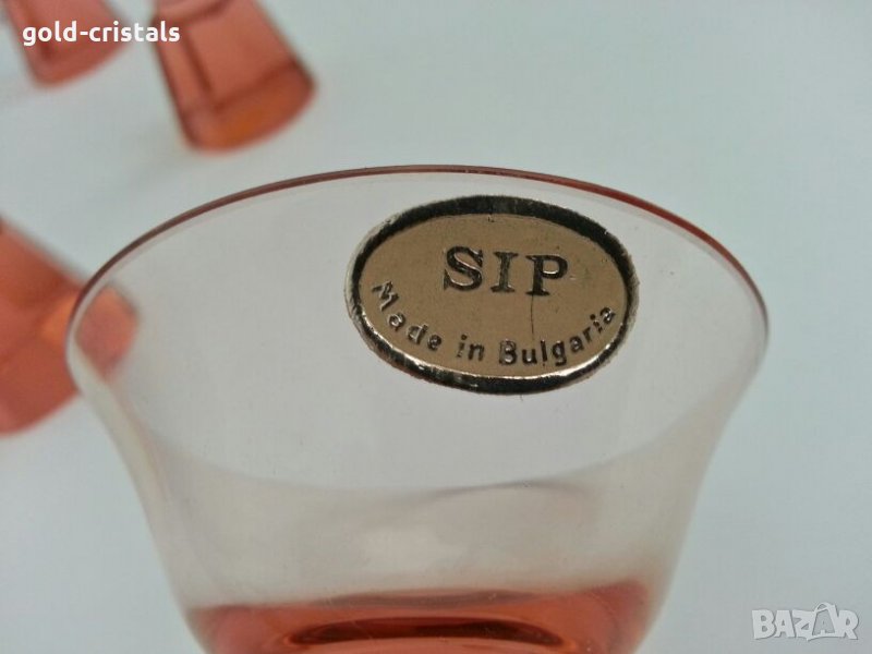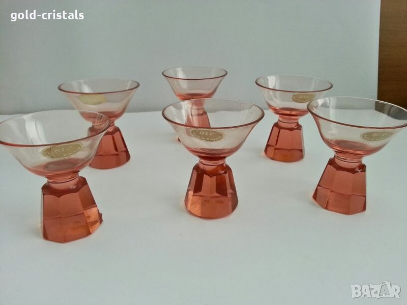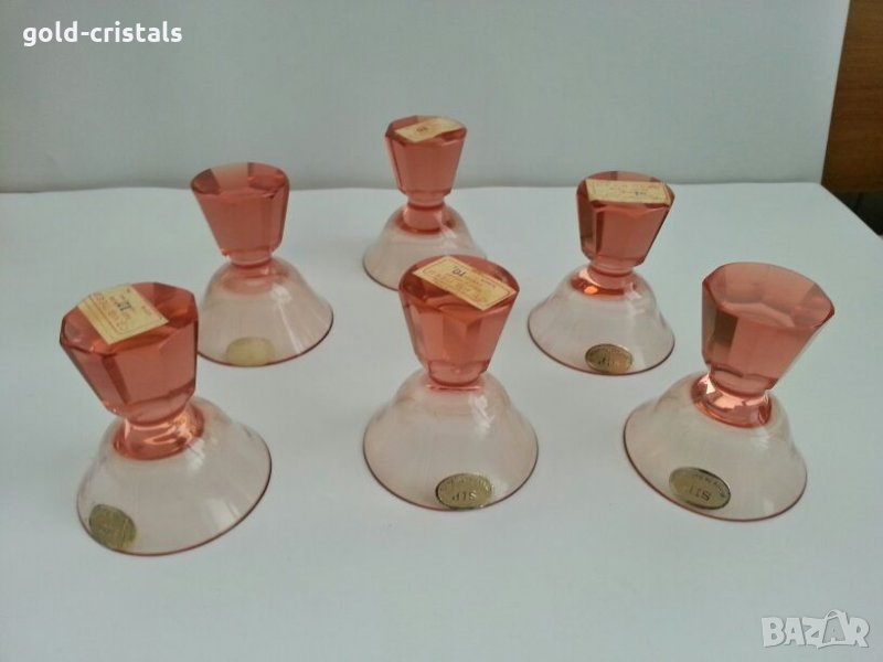 Ангикварен сервиз 53г СИП 6бр чаши и гарафа неизползван с етикети цветно стъкло кристално стъкло комплект сет лот ретро арт декор винтидж колекция стари антикварни предмети обзавеждане за дома и семейството подходящи за подарък за ценители и колекционери