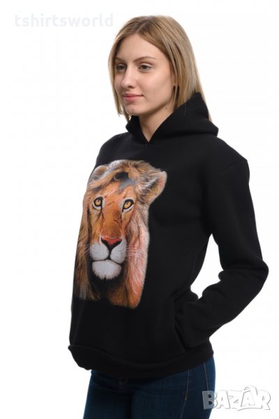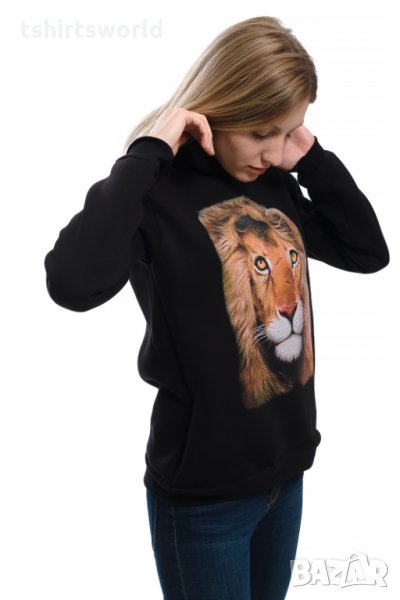 Страхотен нов черен дамски суичър с качулка, две джобчета и трансферен печат Лъв. Произведен в България от висококачествен 100% памук - триконечна пенирана вата с кардировка, което го прави изключително топъл и желан от нашите дългогодишни клиенти. Моделът е подходящ за пролетния и есенно-зимният сезон, има ластични маншети на китките и ханша, запазващи топлината. Разполага с мека подплата и два отворени джоба в страни. Свободната кройка го прави подходящ както за спорт, така и за ежедневно носене с дънкови панталони. Марката PRINTEX от години се слави със своите топли и качествени суичъри.