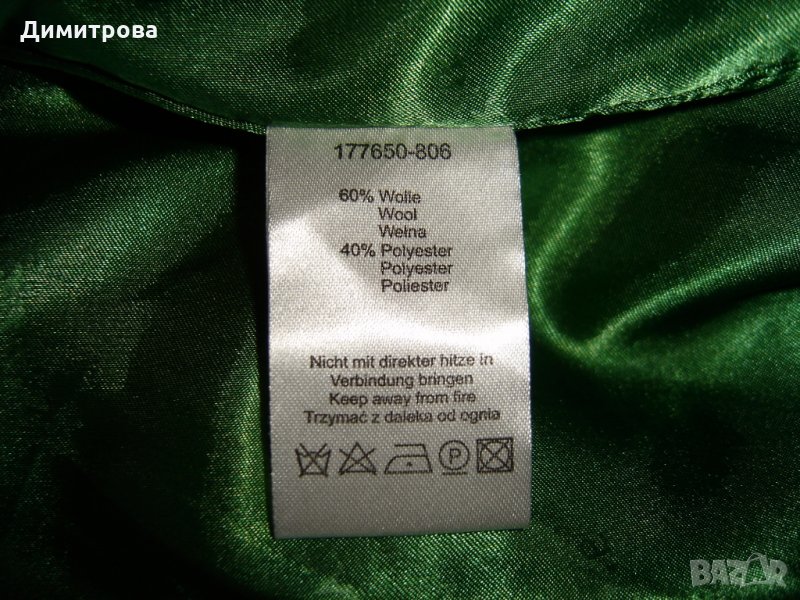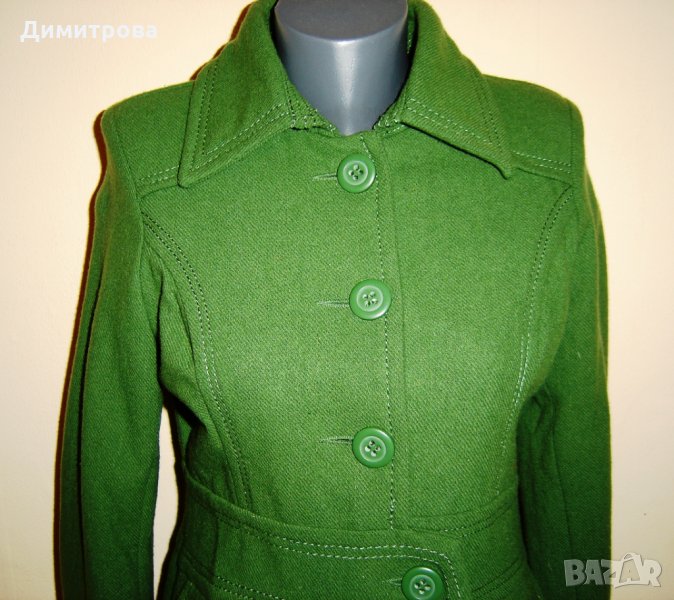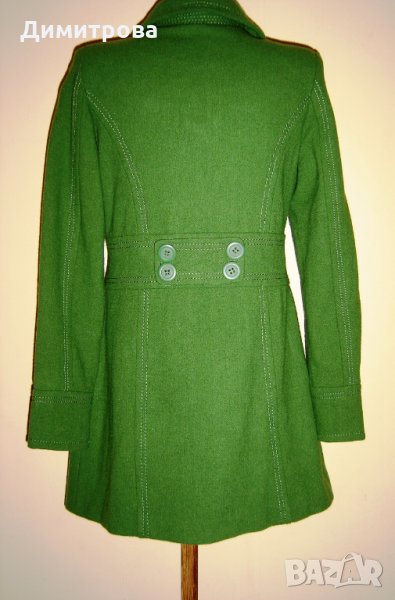 Много красиво палто в граховозелен цвят. Стилен, женствен модел, стои страхотно! Високо качество на изработка и материя, която е с 60% вълна