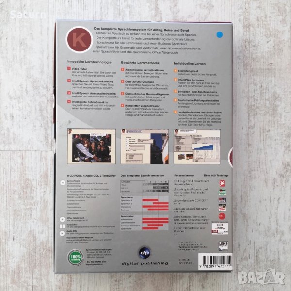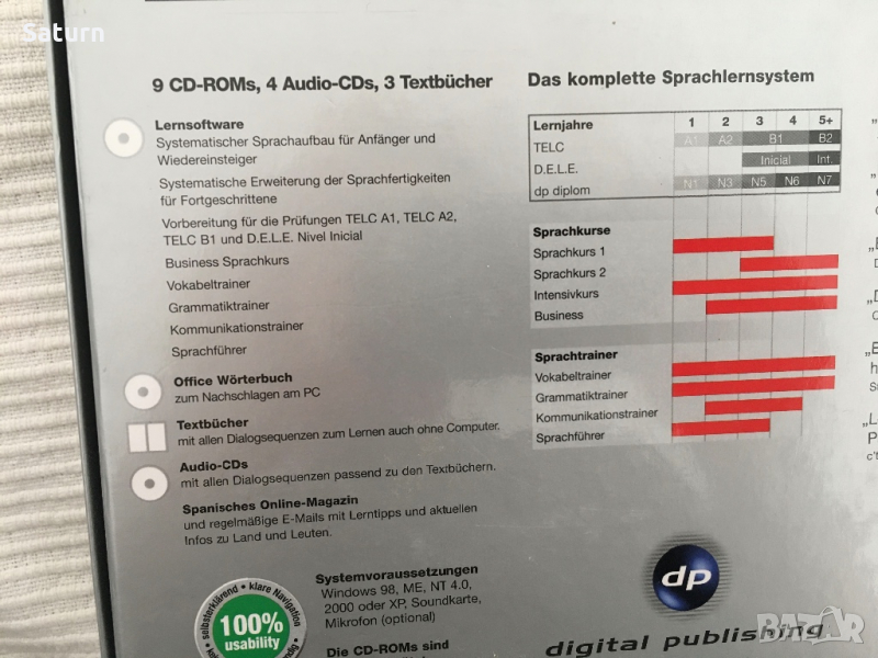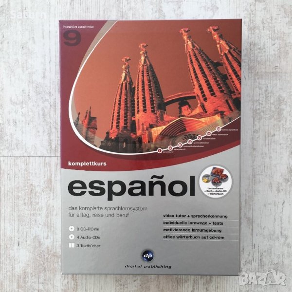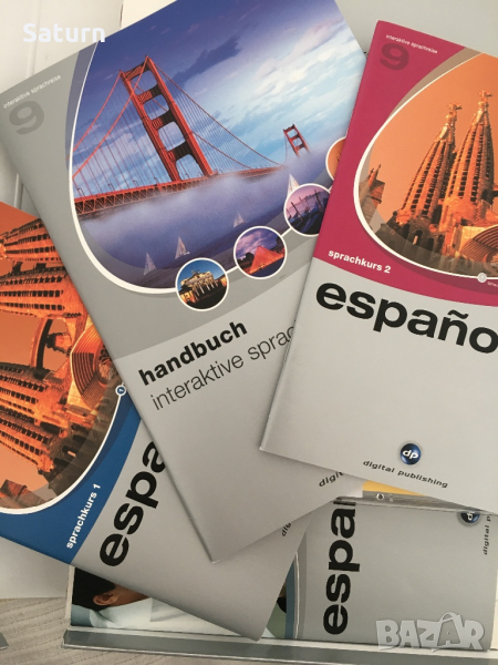Пълен курс по испански, версия 9, на реномираната немска фирма digital publishing, много запазен, не е бил употребяван никога, върви и на Windows 10. Курсът е наистина огромен и от най-реномираната немска фирма за езикови курсове. Лаптопът ми е с Windows 10 и работи на него. Купуван е за 199 евро. Обясненията са на немски, но може да си превеждате от испански на български с речник, ако не знаете немски. Текстовете, диалозите, говоренето са на испански. Минаването на курса отнема месеци - толкова много информация има. Продавам го на символична цена, защото съм се отказала да уча испански. Има и 3 малки книжки вътре. Това е пълна езикова система, на снимката може да видите за кои нива е.