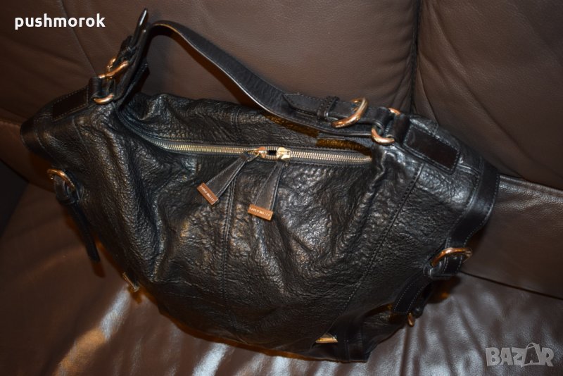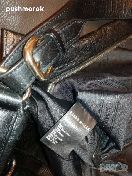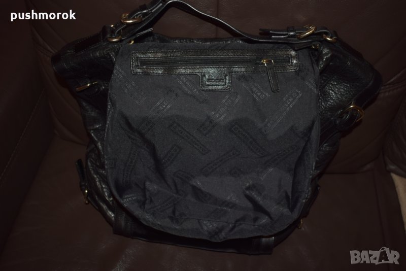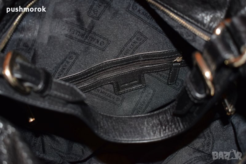 С катарамки в златно и следните размери : височина 40 см., ширина горе 48 см., ширина долу 44 см. Чантата има едно голямо основно
