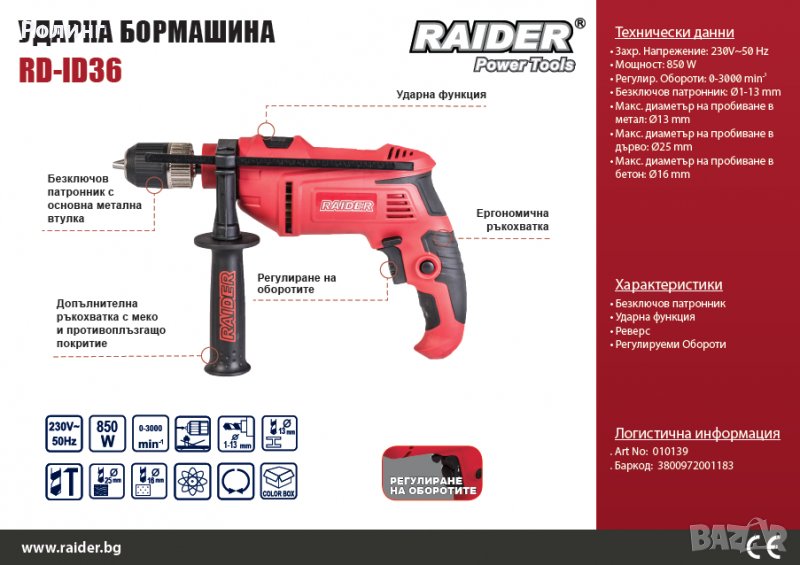 УДАРНА БОРМАШИНА RAIDER RD-ID36 Арт. № 010139 → Обява 27530992