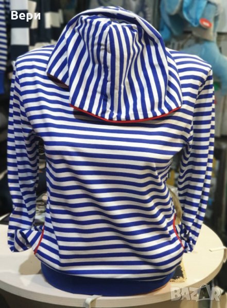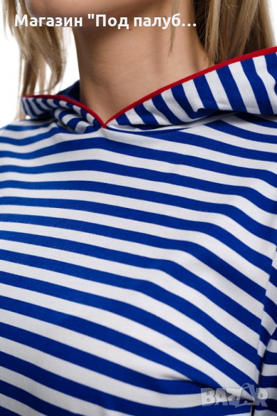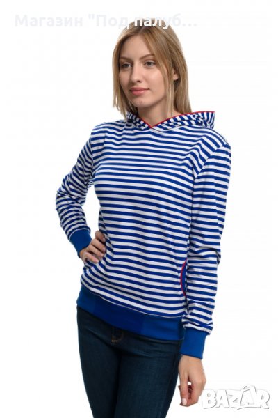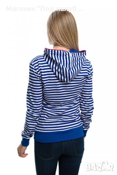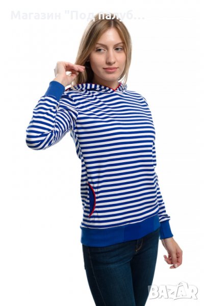 Нов дамски моряшки суичър на синьо/бяло райе, с качулка