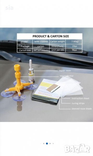 монтният комплект Windshield е много лесен за използване,той ще ви помогне да поправите пукнатината в предно стъкло само за 20 минути. Този комплект ще сведе до минимум видимоста на пукнатините и ще спре разпространението им в предното стъкло.Премахвайки въздуха от мястото на счупване го запълва с трайна смола и го прави още по-здраво от преди. За най-добри резултати ремонтът трябва да се извърши колкото е възможно по-скоро след поражението и преди мястото на спукване да е замърсено с мръсотия или вода.