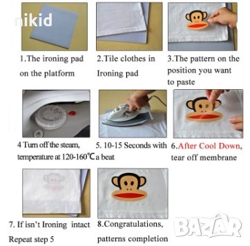 Поставете върху желана дреха -БЕЗ да премахвате защитно фолио , покрийте с парче плат,след което с топла ютия 120-150 градуса за 10-15 секунди минете отгоре ,след което отлепете защитното фолио.