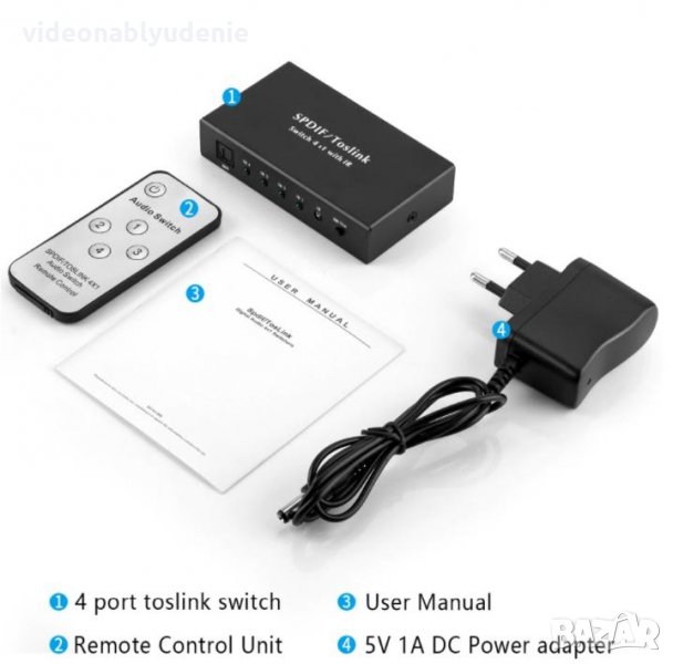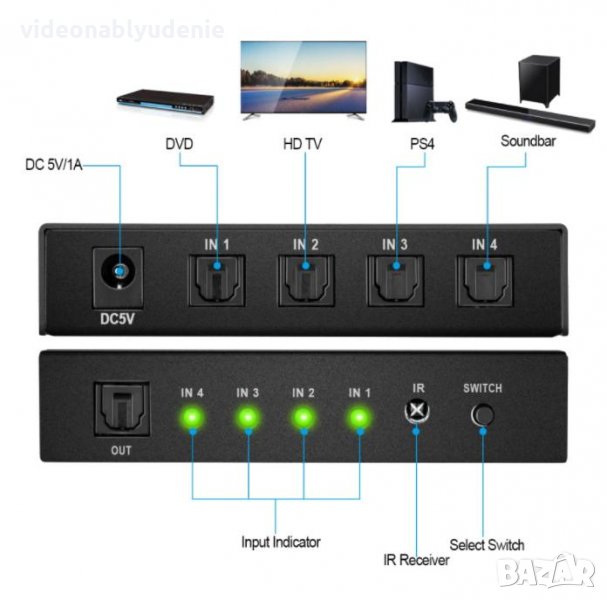 1 x 1X4 SPDIF TOSLINK Split Switcher Дистанционно Цифрово Оптично Аудио 1хOUT 4хIN LPCM2.0 DTS Dolby-AC3