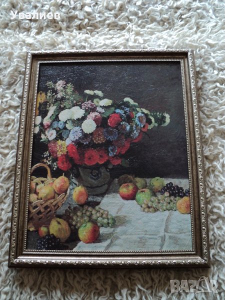 №54. Продавам картина репродукция - шеста снимка - натюрморт на Клод Моне. Картината представлява печат върху платно, опънат на подрамка. Ръчно е нанесен гел придаващ релеф на изображението, който доближава репродукцията до оригинална картина. Размери на картината с под рамка - 40/32 см. - Цена - 65 лв.