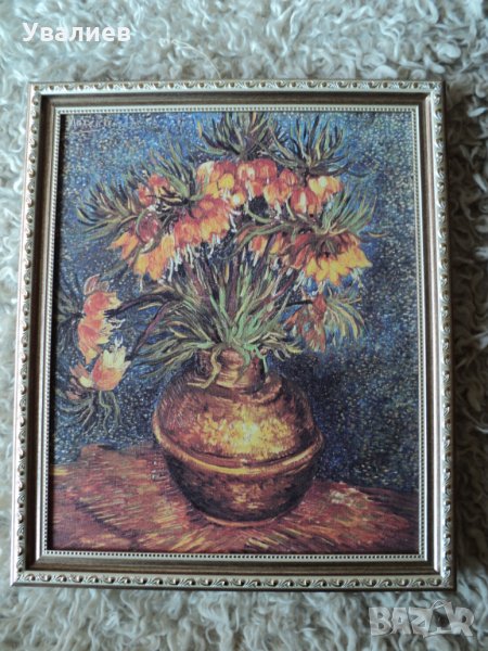 №56. Продавам картина репродукция - осма снимка - Императорската ведрица в медна ваза - Ван Гог - размерите на картината с под рамка - 40/33 см. - размерите на картина с рамката е 45.5/38.5 см. Картината представлява печат върху платно, опънат на под рамка. Ръчно е нанесен гел придаващ релеф на изображението, който доближава репродукцията до оригинална картина.Цена - 67 лв.