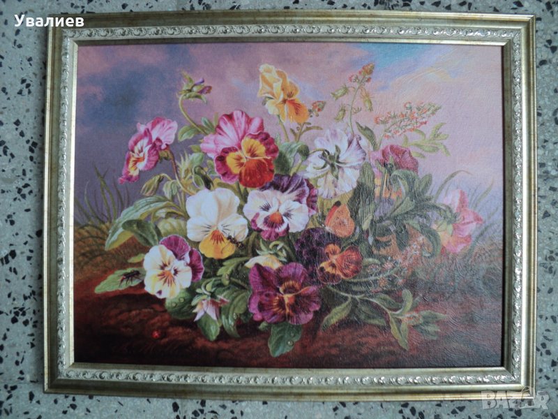 №58. Продавам картина репродукция - десета снимка - Трицветна теменуга - Антон Молис - Картината представлява печат върху платно, опънат на подрамка. Ръчно е нанесен гел придаващ релеф на изображението, който доближава репродукцията до оригинална картина. Размери на картината с под рамка - 40/30 см. - цена - 67 лв.