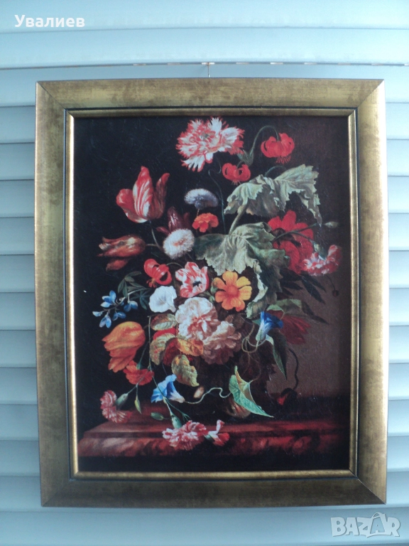 №59. Продавам картина репродукция - единайста снимка - Цветя във ваза - Ван Брюксел - Картината представлява печат върху платно, опънат на подрамка. Ръчно е нанесен гел придаващ релеф на изображението, който доближава репродукцията до оригинална картина. Размери на картината с под рамка - 40/31 см. - цена - 68 лв.