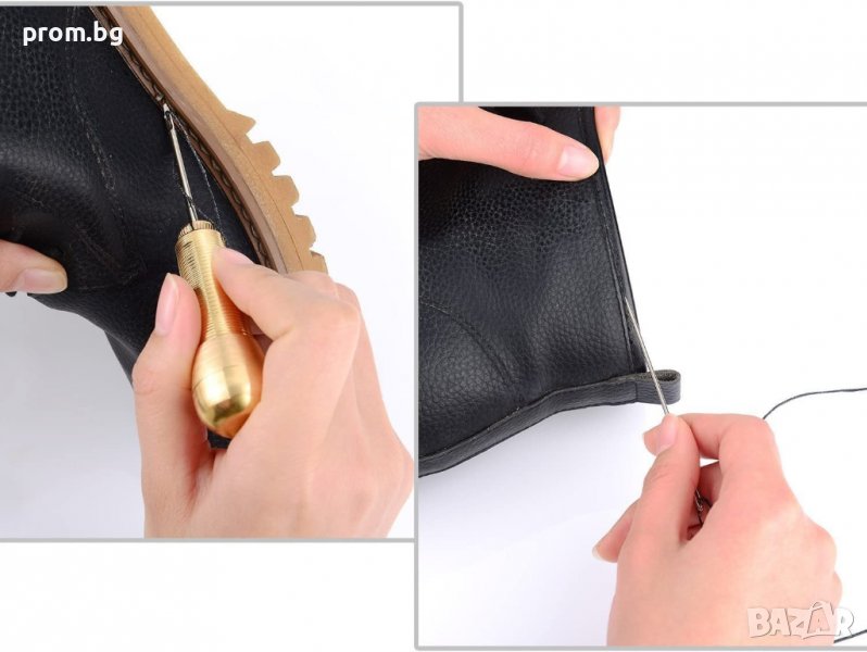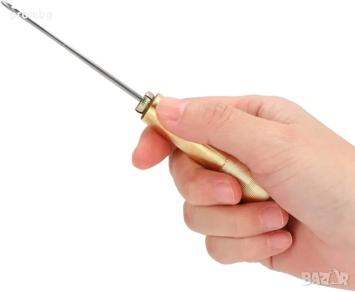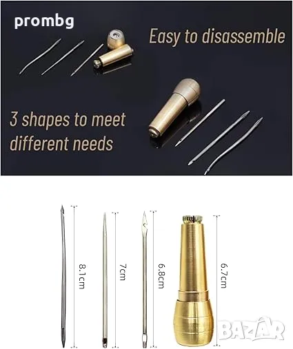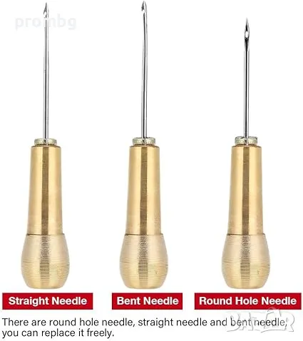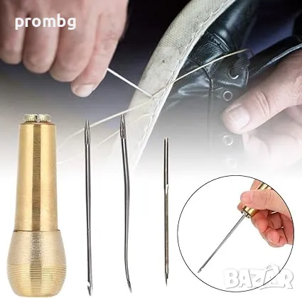 кожарско, сарашко шило с 3 игли за ръчен шев. Подходящо за шиене на дебело платно, брезент, кожа, шиене на обувки, подметки, чанти и др. Игли - тип кука, извита и права. Размери на дръжката: 6,7 см. Размери на иглите: прибл. 6,8 см; 7 см; 8,1 см.
