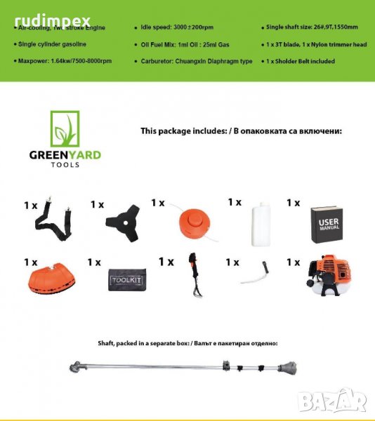 - Вид двигател, капацитет: 1 цилиндър,с въздушно охлаждане,двутактов, бензинов, 52 куб.м.