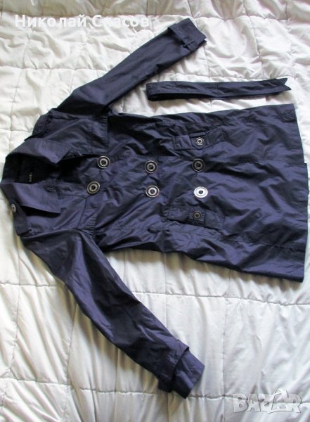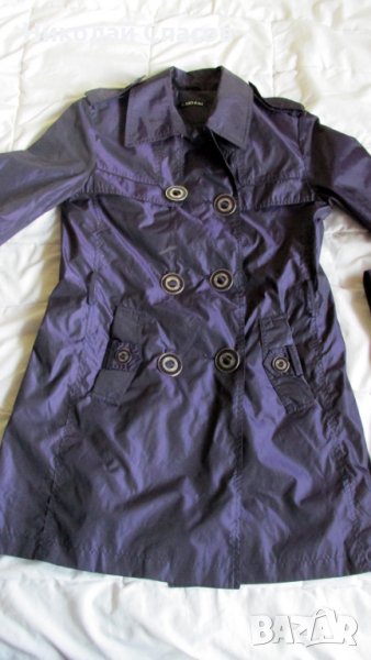 Дамско/женско дълго яке . Ново, не е ползвано нито веднъж - вижда се на снимките, въпреки лошото им качество. Взимано е за 45 лв. Размер 42: дължина от рамото до долу ̴ 81см., от подмишницата до долу ̴ 58 см., талия отпред ̴ 47 см, цвят - лилав, леко преливащ.